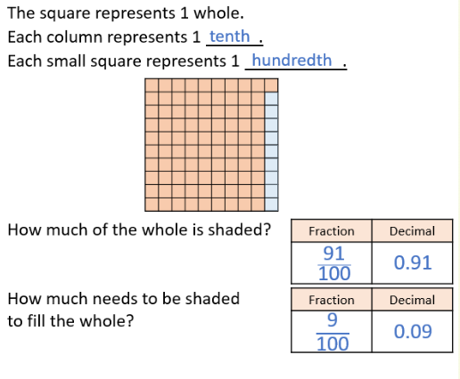 Our current unit in maths is decimals. We are using our fractions knowledge to understand tenths and hundredths. Next term, we will be able to use our knowledge to work out the relationship between quarters and halves and decimals.